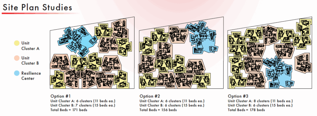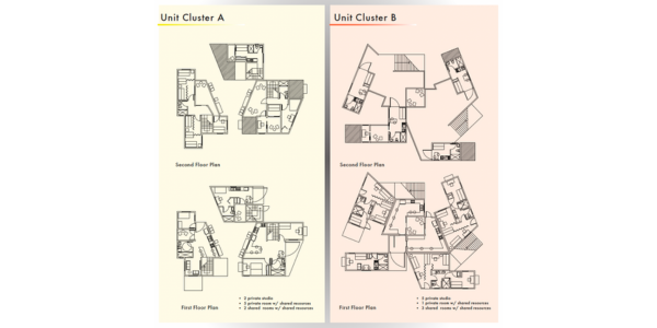 The units are designed to explore the leaning qualities of a trapezoid, similar to those found amongst family, friends, and neighbors. Divided in two and paired together to assemble a composition that responds to the average Altadena 2.7 household, with particular consideration for people with disabilities, and working class professionals. A substantial amount of flexible opportunities are available at the lower levels of the clusters, for people with disabilities. The exploration between the two compositions promotes an expansive space of connection. The project also gives unique opportunities to indoor/outdoor living in both the lower and upper levels. This study showcases a simple shape transformed through rotation, alignment, and distancing in order to articulate perspectives that are dynamic, uplifting and comfortable for their transitional chapter after the Eaton Fire.