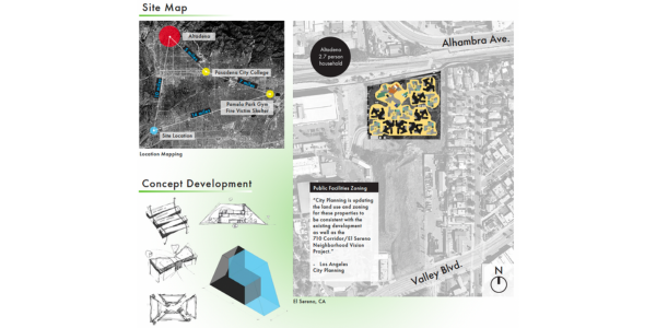 The site itself is about 10 miles from Altadena and a result of decades of disruption, with Caltrans acquiring neighborhoods in Alhambra and El Sereno through eminent domain. In order to connect the 710 freeway from South Pasadena through El Sereno in the 1950s and 1960s, a project that was legally terminated in 2019 by Gov. Gavin Newsom. As a result, the current zoning has been zoned as Public Facilities, resulting in an unusual mix of commercial, industrial, and residential buildings nearby. On the North side of the site are train tracks, and to the East is a residential part of Alhambra.