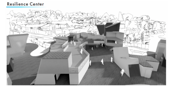 El Sereno Resilience Center is located on the northwest side of the site with primary access from Valley Blvd., and secondary access from Front Street. It works as a buffer from the noise. The pathways encourage access from the surrounding parts of the neighborhood to encourage community interaction and offering services such as kitchens, spaces for health care, education, public gatherings, and public showers and restrooms. The space opens and closes dynamically to respond to the warm climate in El Sereno and offers natural ventilation, lighting, and flexible ways to circulate throughout the center. Perspective is explored similarly to the transitional housing units by rotating, combining, and expanding elevations. The center stands as a beacon for survivors from the Eaton Fire, and a shared space of learning and renewal for residents from Alhambra and El Sereno. It is a space for people to learn, rebuild, and move forward together on a planet that constantly teaches us resilience.