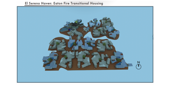 El Sereno Haven centers on community resilience, and offers transitional housing as well as a community center for these under-resourced neighborhoods. Community is encouraged through shared resources. The project is a flexible trauma informed design proposal with various openings and shading for a comfortable stay in the transitional housing units. Perspective is explored through the trapezoidal prism being divided and reassembled into new spatial configurations, gaining stability through interconnectedness. The project is more than shelter: it attempts to bring people together after the Eaton Fire, responding to site conditions, climate, and shared spaces and resources during their transition.