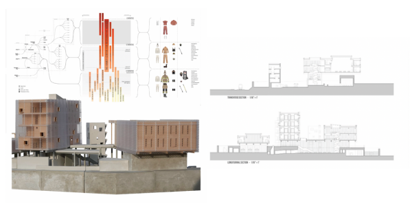 Architecturally, the project mediates between two material and formal identities. The first is demonstrated on the ground floor in the administrative and operative program. These elements are made of cast-in-place concrete and sunken into the ground. This is complemented by the housing blocks which span and cantilever over the site, celebrating their own lightness. These two identities are mediated by and define the community spaces situated between them.