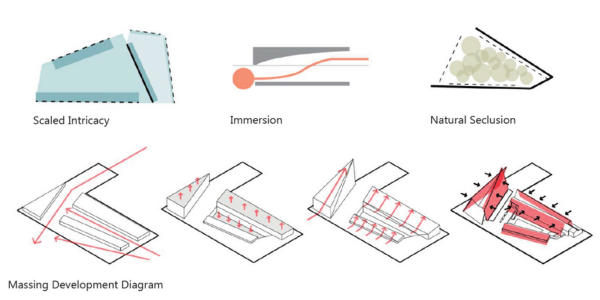 By referencing academic and natural precedents, the project produces an environment of intimate seclusion and immersion into thought which enables one to transcend their physical reality to discover peaceful understanding in the spiritual.