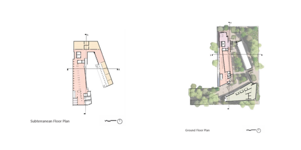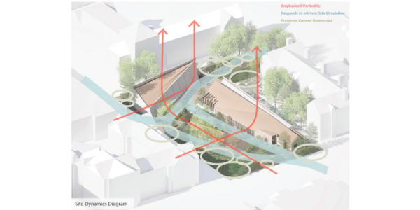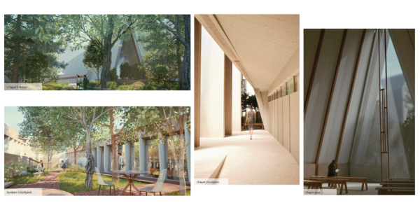 Through the careful observation of the site’s existing dynamics, three main axes were discovered to be used as the formal foundation for the design. By intersecting these axes with the site, three main structures are formed, which impact the negative space of the project through the formation of a central courtyard. By sinking this portion of land down into the site, it allows for a further layer of procession before entering and encountering the chapel, therefore preparing visitors for their ultimate arrival. Additionally, this space embeds the user into a moment of quiet pause, as they are immersed in the natural foliage and pause in the site, and can use this space as a place of rest.